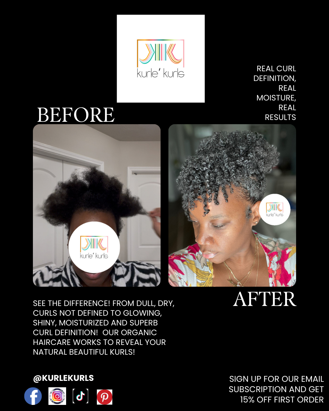 Our mission and purpose are to ensure the ease of maintaining natural healthy hair with quality, affordable and cruelty free products. Whether kinky, curly or wavy, Kurle' Kurls was created to guarantee the vital ingredients essential to enjoying, styling and rocking your natural hair!